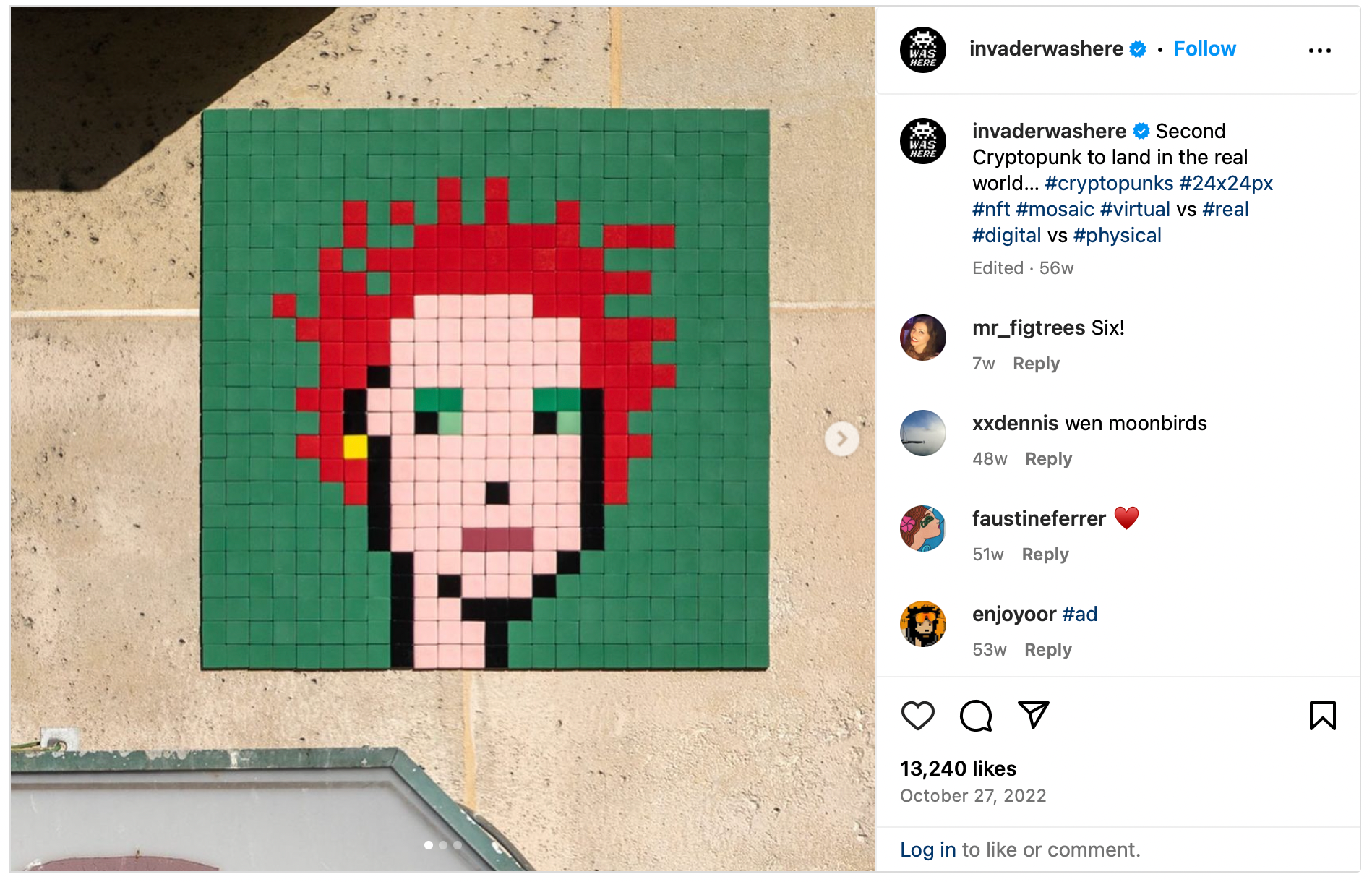 I'm always on a mission to promote CryptoPunks. I love brainstorming with various artists to come up with unique ideas, like the Invader Punks in Paris. And I'm not alone in this — a CryptoPunks movie is coming out soon.